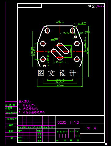本次设计的齿轮泵垫片,是一个平板,基本工序有落料,冲孔,所选材料为Q235A钢,此材料属于普通碳素钢,其抗剪强度310-380MPa,抗拉强度380-470MPa,屈服极限240MPa,通过对零件尺寸和形状分析,选择复合模设计最合适,具体见CAD图纸。