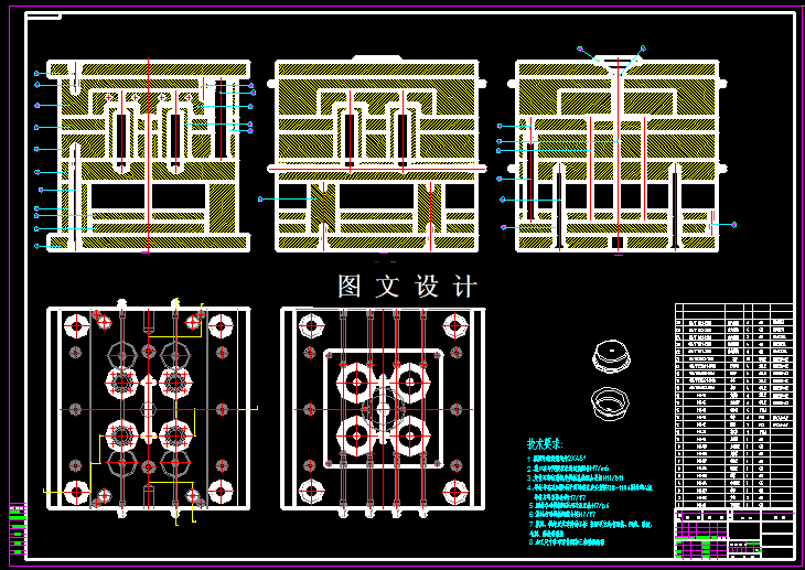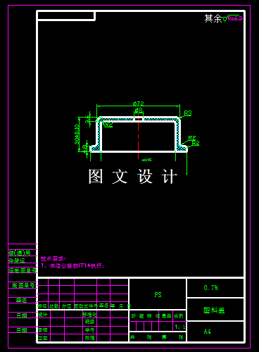 本次设计的是盖类零件,形状简单,所选材料为HIPS,产品的是圆形,尺寸比较小,考虑到模具加工难度,所以采用一模4腔,对称分布设计,分型面的形状采用平直分型面,将分型面选在塑件外形最大轮廓处;并使塑件在开模后留在动模一侧,有利于塑件的顺利脱模,具体见图。