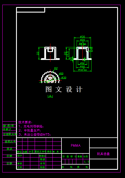 本次设计的塑料尺寸较小,精度不高,为方便脱模,采用推杆均匀顶出,所以采用一模两腔,并不对制品进行后加工,产品表面不留痕迹,透明度高,因此采用四板模和侧点浇方式,型芯和型腔可以采用镶件式加工。