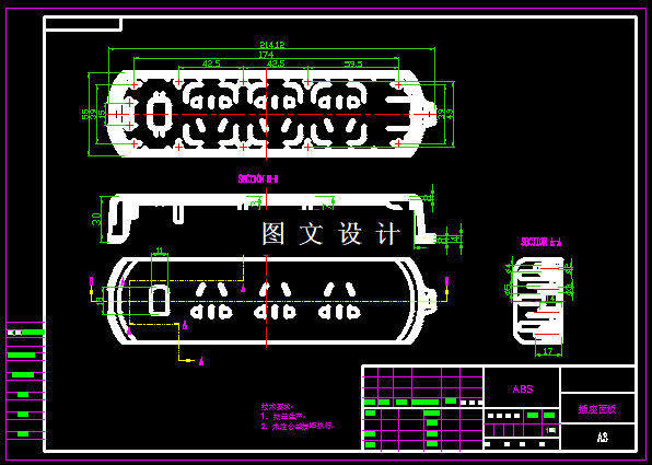此零件是一种常见插座盖板塑件、其最大的尺寸长宽高:214.12mm×55mm×30mm,所选材料为ABS,中间有缺口连接,而且内部结构复杂,又是外观件,给模具结构设计增加了很大的难度,工件本身有锥度,所以无需考虑脱模角度,结合工件形状选择一模两腔。