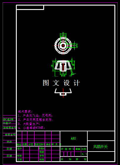 本产品是生活中常见的风扇开关,所以零件的外观要求比较高,塑件高度在30mm以下时可以不考虑脱模斜度。本产品内腔高度为15mm,且有大圆弧过渡,产品自带斜面,没有直边,所以无须考虑脱模的斜度,产品壁厚均匀,为2mm。这样更适合设计注塑模具,模具结构见CAD图纸。