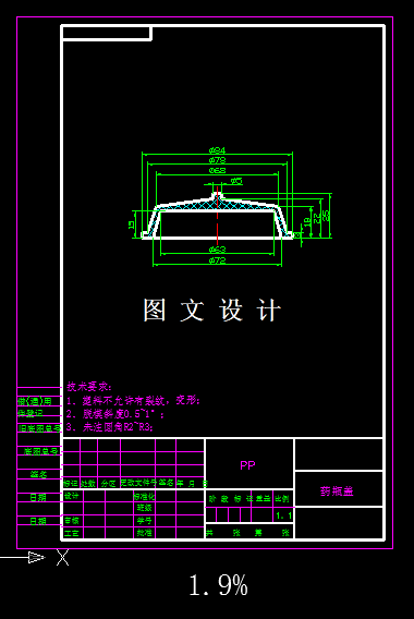 该塑件为药瓶盖,外形表面质量要求较高。在选择分型面时,一定不能影响塑件的外观质量、便于清除毛刺及飞边、有利于排除模具型腔内的气体、分模后塑件留在动模一侧及便于取出塑件,所以分型面应选择在塑件外形轮廓的最大处,如CAD图所示。