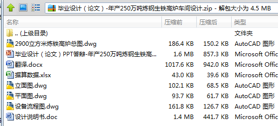 设计的主要内容包括炼铁工艺计算(包括配料计算、物料平衡和热平衡)、高炉炉型设计、高炉各部位炉衬的选择、炉体冷却设备的选择、风口及出铁场的设计、原料系统、送风系统、炉顶设备、煤气处理系统、渣铁处理系统、高炉喷吹系统和炼铁车间的布置等。另外为了更加具有科学性,本设计参考了国内外的相似高炉的生产经验和数据。