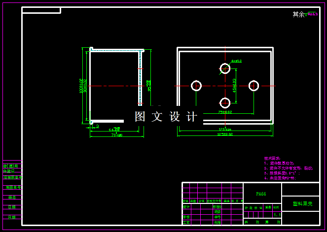 该零件是塑料盖,体积不大,形状为矩形,整体结构比较简单,中间是空的,工件壁厚均匀,塑件表面不允许有残料余留,所以这里选用点浇口,根据年产量要求,选择一模两腔,通过优化后,合理分布。
