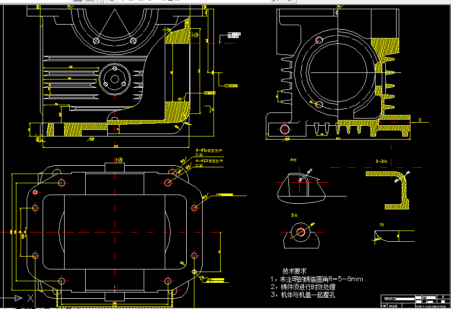 灰铸铁具有很好的铸造性能和减振性能。为了便于轴系部件的安装和拆卸,箱体制成沿轴心线水平剖分式。上箱盖和下箱体用螺栓联接成一体。轴承座的联接螺栓应尽量靠近轴承座孔,而轴承座旁的凸台,应具有足够的承托面,以便放置联接螺栓,并保证旋紧螺栓时需要的扳手空间。为保证箱体具有足够的刚度,在轴承孔附近加支撑肋。为保证减速器安置在基础上的稳定性并尽可能减少箱体底座平面的机械加工面积,箱体底座一般不采用完整的平面。