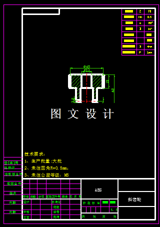 此零件是一种常见斜齿轮塑件,本次设计难点在于塑料的成型,有两点,一是侧面有两个圆孔,无法正常脱模,需要两边抽芯设计,二是斜齿轮脱模机构,需要设计旋转脱模,本次设计结合两者的要求,选择手工旋转脱模,保证螺纹的精度和尺寸。
