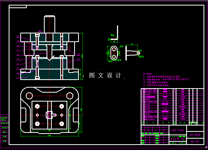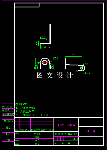 本次零件为典型的V形弯曲,所以基本工序有落料,冲孔,弯曲等,展开后的形状为T形,一头大,一头小,可以采用错位排样法,错开后落料时会紧靠一起,所以要错开落料,这样可以充分提高材料利用率,孔到边的距离太小,所以只能设计成冲孔落料级进模,然后通过弯曲模,将已经落料好的零件压成V形。