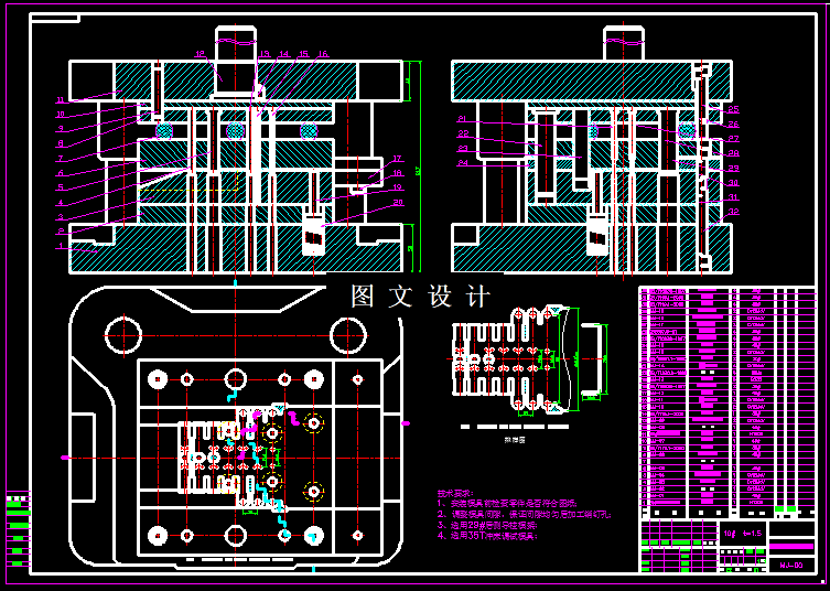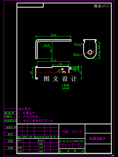 本次零件的零件是电器连接件,工件整体成L形,所以基本工序为外形下料,冲孔,弯曲,由于弯曲时单边受力,所以最好按对称零件设计,一次冲两件,然后中间切开,所以在中间打孔之后,再弯曲,中间设计载体,最后切断,产品与模具分离,展开后的外形比较复杂,需要多次冲裁才能实现外形,具体排样图见CAD图纸。