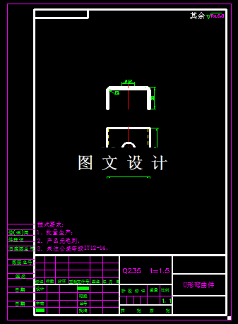 本次设计的课题是U形零件自动级进模设计,根据形状分析,工件呈U形弯曲,底面有个圆孔,适宜采用单排排样,载体设计在中间,将弯曲的方向设计成向下弯曲,工件展开后形状规则,尺寸比较大,所以需要采用两边侧刃定位的方法,采用两侧刃切除后,可以将条料宽度直接切到所需要的尺寸,然后再冲搭边废料,这时要保留中间的搭边值作为工件之间的载体,此载体是在工件弯曲之后,最后切断,产品与条料分离,同时可以离开模具,成为最后的成品。设计内容包括模具平面图,零件图,3D图,运动仿真视屏,设计