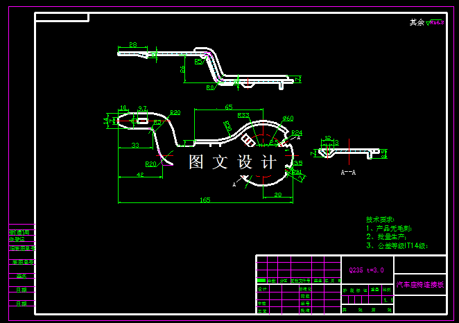 本次设计零件是汽车座椅连接板,工件有一处弯曲,属于Z形弯曲,产品一侧翻边,属于不对称件,弯曲和翻边方向相同,所以可以在同一个工序里实现。该零件底面有多个压舌孔,还有中间的梅花孔,所以这些孔是在成型之前冲裁还是在成型之后冲裁,是需要考虑的关键因素,孔的最小直径为φ8mm,所以大于两倍材料厚度2t=6mm,适合冲压,所以设计方案比较合理。