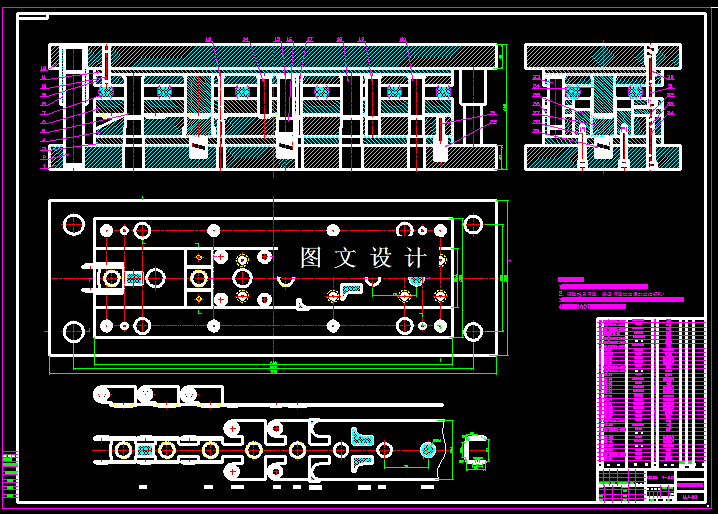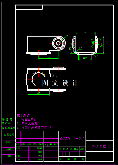 此工件的形状较简单,且对称,整体属于弯曲件,弯曲部分圆角过渡,在设计排样时,考虑到弯曲工序的设计方向,本次设计方向向下,根据零件的形状可采用双边切侧刃的定位方法,在切废料之后,条料改为中间料做载体,这样既保证了条料的浮离送进,又不妨碍废料的分离和弯曲成型。