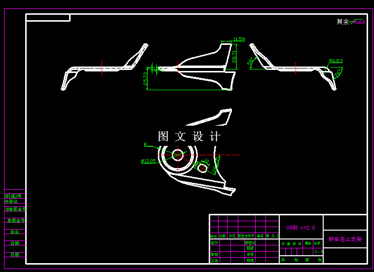 本产品为典型的Z形弯曲,即两边弯曲方向相反,弯曲过渡R角比较大,尺寸没标公差,属于自由公差,可以直接按毛坯的断面中性层尺寸计算,所以完全依靠理论数据,无法计算和绘制出展开图,需要借助软件和经验来计算,展开之后结合形状分析选择合适的排样方案。