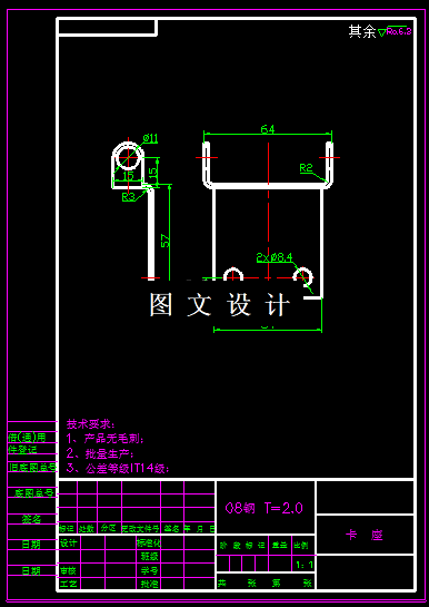工件图形分析,有一边有两次弯曲,是V形弯曲,单边还有U形弯曲,这两个地方弯曲的方向不同,所以在一道工序里难实现,最好是采用多道工序弯曲。该零件侧面有2个8.4mm的圆孔,;侧弯曲面还有连个圆孔,不在产品同一平面,孔边与孔边之间的距离是7.5-5.5=2.0,小于两倍材料厚度2t=4mm,所以此孔需要与外形分开冲。分析后发现工序比较多,所以只能设计成级进模,具体见CAD图纸。