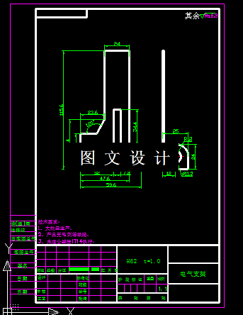 此工件的形状较简单,属于V形弯曲件,基本工序有落料,冲孔,弯曲。首先要对工件进行展开尺寸计算,设计出展开图,根据图形尺寸,合理计算答辩值,设计出排样图,此类零件一般是一次冲两件,对称设计,最后工序切开,成两个零件,生产效率提高一倍,具体见CAD图纸。