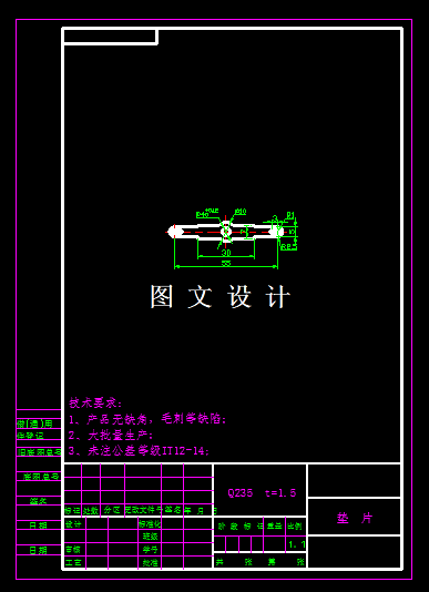 该零件结构简单,形状对称,尺寸较小,强度要求不高,最小孔径2mm大于t,产品材料厚度为1.5mm,所选材料为Q235,属于普通碳素钢,材料抗剪强度310-380MPa,抗拉强度380-470MPa。此材料具有较高的弹性和良好的塑性,其冲裁加工性较好。