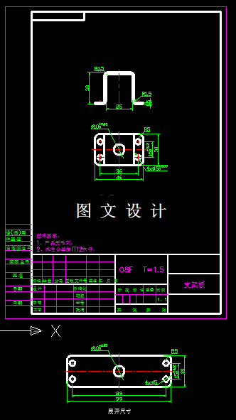 产品属于弯曲件,圆角过渡,所以方便设计模具,几字形弯曲件,属于四角弯曲件,尺寸没标公差,属于自由公差,弯曲R角大于0.5,所以无法选择小R角的计算公式,可以直接按毛坯的断面中性层尺寸计算,计算后,根据展开图设计合理的排样结构,然后设计模具结构,编制说明书。