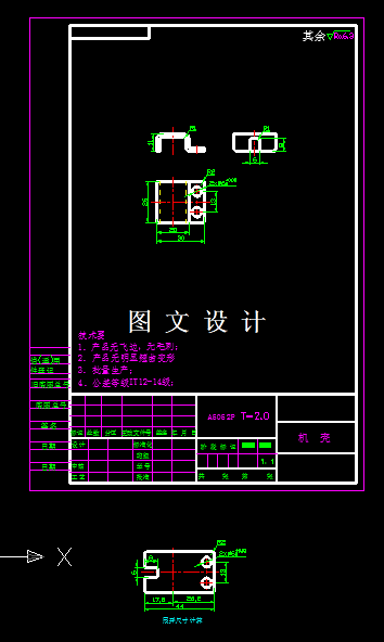 此制件的形状较简单,产品属于弯曲件,工件四周圆角过渡,为便于模具的加工,减少冲压时在尖角处开裂的现象,同时也可以防止尖角部位刃口的过快磨损,所使用的材料为A5052P,为AL-Mg系合金铝板,设计的级进模,采用正装结构,凹模在下模,采用弹性卸料装置,具体见CAD图纸。