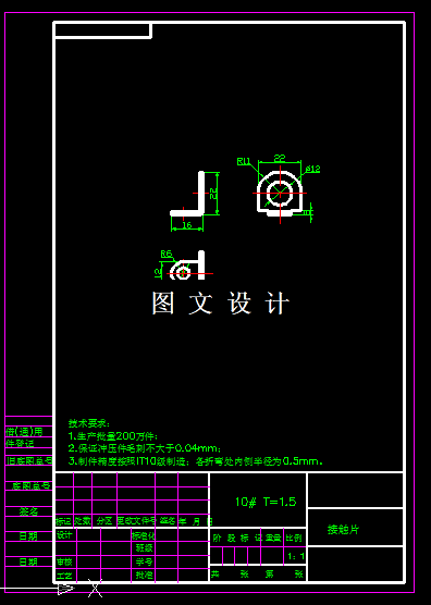 本次设计的形状是L形件,针对这样的零件,最好的方案,是采用中间载体,两侧冲裁的方法设计模具,两件同时冲裁,中间连接部分做载体,最后切断,冲一次可以同时出两个零件,生产效率可以提高一倍。