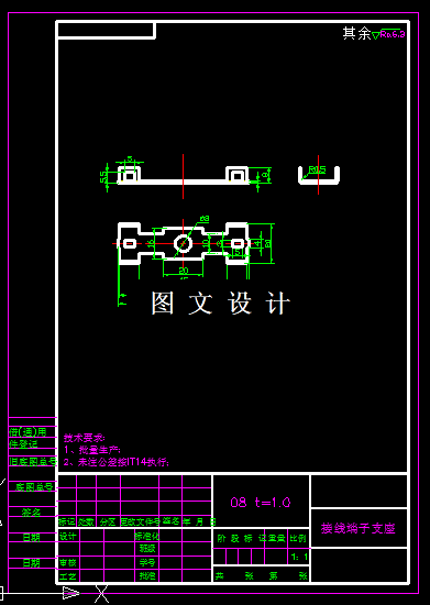 该零件,整体形状为U形件,但是外形不规则,由很多线段组成,孔也比较多,所以如果采用级进模设计,设计的难点在于弯曲部分,是向上弯曲还是向下弯曲,根据形状分析选择最合理的设计方案,绘制出排样图,根据排样结构设计模具整体结构,零件图,编制设计说明。