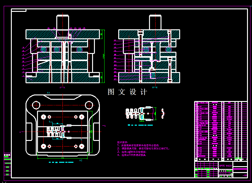 本次课题为缝纫机支架,产品中间孔为螺纹孔,M4的螺纹孔径查询其底孔为φ3.2,所以可以先用模具冲出φ3.2的圆孔,再通过机加工,攻丝,达到M4的螺纹孔,两侧面的孔属于半冲裁状态,就是说冲孔,但是不冲断,只切一半,冲裁截面垂直,此类工序可以按冲裁模具来设计和计算,仅仅在冲压过程中,通过调整冲压滑块高度,保证不切断的孔的高度,来保证凸包高度1.5,图形和工序分析之后,工件就比较简单了,本次设计就是设计该工件的多工位级进模,包括模具装配图,零件图,立体图。