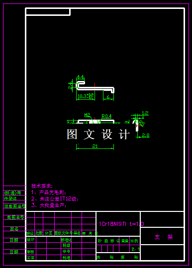 该制件中间形孔与两条0.8mm宽的槽的作用是调节螺钉旋入M2螺纹后不会产生松动。尺寸2.4mm的U形弯曲角要求小于90度,M2螺纹孔中线至弯曲边缘距离为10.3.如果采用单工序模具生产,其工艺程序是:落料,冲孔,冲槽,整平,压弯,压筋,弯直角,弯U形共8道工序。本次设计针对该零件设计多工位级进模,设计内容包括模具结构图,零件图。