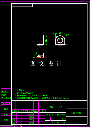 本次针对压线卡滑轮进行模具设计,难点在于多道工序在一副模具里实现,即采用连续冲压的方法,同时要保证产品不能变形。最好是采用双边载体来设计模具,两件同时冲,中间连接部分做载体,最后切断,成两个产品,可以提高生产效率。