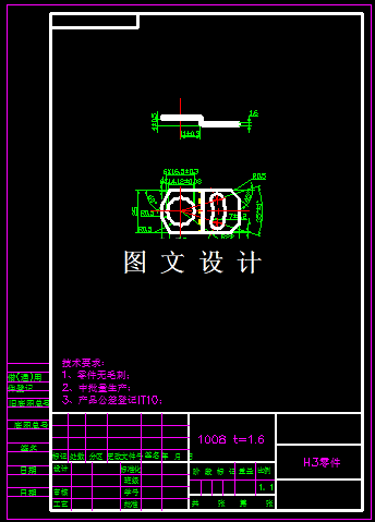 此制件的形状一眼看上去很复杂,尺寸很多,形状怪异,但细看后,产品就两个弯曲台阶,成Z形,然后有一个月牙孔和类似圆孔,难度不大,弯曲部分并且有圆角过渡,便于模具的加工和设计,本次设计内容包括模具装配图,零件图,3D图,设计说明书。