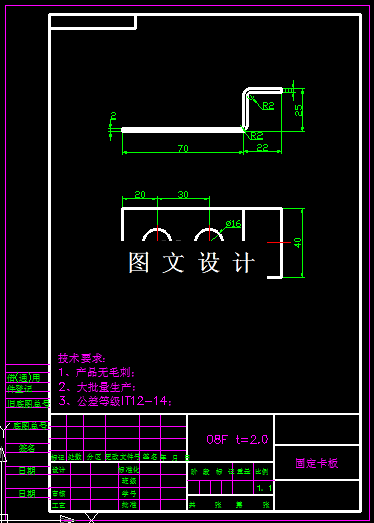本零件采用的是2.0mm的08F钢板料带冲压而成,由图而知该图的零件外形尺寸不大且外形简单,要求的精度也不高。但有两个地方,是Z形弯曲的,弯曲方向一样,所以一次冲裁很难完成。该零件一面有2个16mm的圆孔。从材料来说,该零件比较薄,便于成型,故该零件有利于冲压成型。初步拟定,一出二的模具结构,设计冲压级进模。