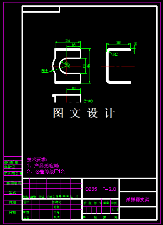 该零件外形尺寸不大且外形简单,要求的精度也不高,属于U形弯曲的,弯曲方向一样,所以一次冲裁很难完成,该零件侧面有2个8mm的圆孔,中间有个缺口。由于圆孔和缺口的尺寸大于2倍料厚,所以不属于深孔冲裁,故没有必要对小孔模采取保护措施,所以对凸模不需要进行强度校核。设计内容包括模具平面图,立体图,计算分析。