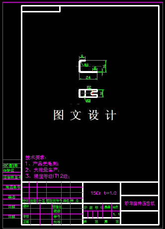 该工件材料厚1.0,形状较不复杂,属于U形零件,但两边弯曲不对称,材料材质为15Cr,厚度为1.0mm。主要工序有冲裁、弯曲。弯曲时考虑最小弯曲半径,查表4-1《冲压工艺与模具设计》取最小弯曲半径 。若采用单工序模,工序很多,工件小,手工操作,定位难以达到精度,生产效率低,误差较大,质量难以保证,因而适宜采用多工位级进模制造,采用多工位级进模制造提高了劳动生产率和设备利用率、降低了生产成本、提高了操作的安全性。