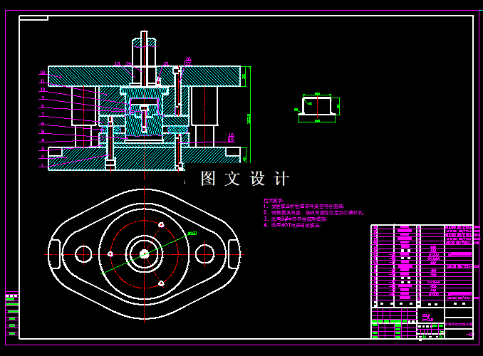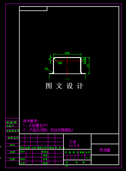 此制件的形状较简单,且对称,有圆角过渡,便于模具的加工和减少冲压时在尖角处开裂的现象,同时也可以防止尖角部位刃口的过快磨损。整个产品属于拉伸零件,侧面有两个3毫米的孔,如何保证两个孔同心,这个将是本次设计的重点和难点。