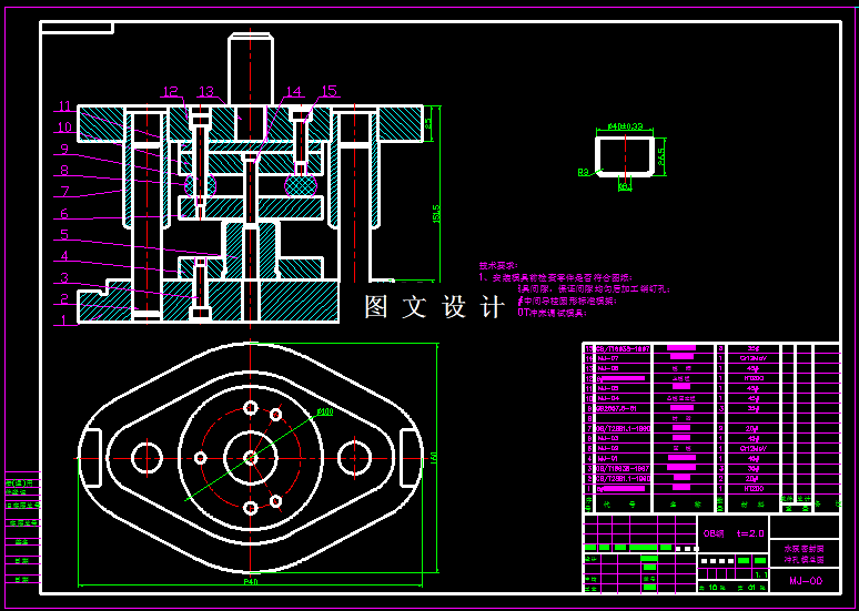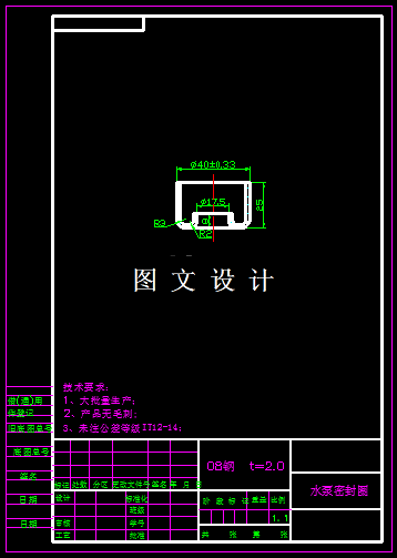 本次课题图形看起来简单,有落料、拉伸、切边、冲孔、翻孔等基本工序,结合计算和工序的合理安排,本次设计,可以将落料拉深一起合并成落料拉深模,冲孔翻孔复合模,由于产品翻孔高度比较大,所以建议冲孔和翻孔分开加工,确保其翻孔高度。所以本产品共三道工序,设计三套模具结构图。