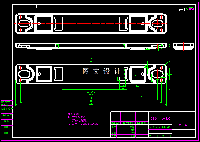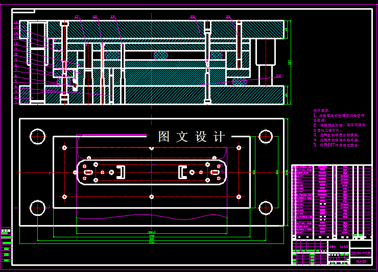 本次设计课题图形,一眼看上去比较复杂,工序分解后就很容易理解,产品外形为矩形,不是圆筒形拉伸件,所以设计落料和拉伸复合模,明显给模具制造增加难度,同时还要考虑是否要切边,如果要切边,必然还要增加模具,所以可以设计成落料冲孔模,翻边模,这样就省去切边模,中间翻孔弯曲单独设计,这样的方法只需要三套模具,结合方案设计模具结构图,三维图,设计说明书,其中两个零件的数控程序。