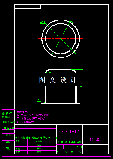 此制件为帽盖,其形状较简单,且对称,有圆角过渡,便于模具的加工和减少冲压时在尖角处开裂的现象,所选材料为日本spcen钢,此材料为深冲用冷轧碳素钢薄板及钢带,相当于中国08AL(5213)深冲钢。通过对工件拉深系数的详细计算,确定合理的冲压工序,设计出合理的模具结构,包括模具装配图,立体图,设计说明