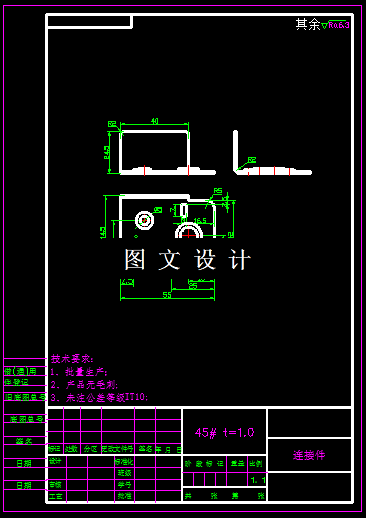 本次设计的是连接板,根据工件形状分析,基本工序有落料,冲孔,弯曲,根据工序结合方法,选择合理的工序复合,先冲异型孔,后弯曲,考虑弯曲过程对两侧材料时候有影响,材料时候会向外拉延,这个需要通过试模时才知道,所以展开计算只能是理论计算。本次设计工序是落料冲孔模,弯曲模,包括模具3D图,平面图,设计说明