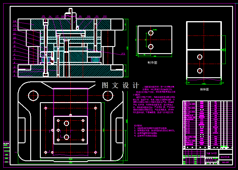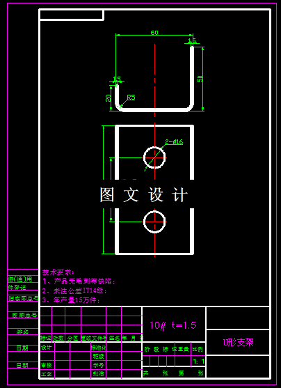 本次课题叫U形件,形状为U形,两侧弯曲高度不一致,但是形状规则,所以冲压工艺很明显,基本工序有落料,冲孔,弯曲,根据工序结合原理,落料和冲孔可以复合成复合模,所以本次设计落料冲孔复合模,弯曲模。设计内容包括平面图,装配图,设计说明书,加工工艺。