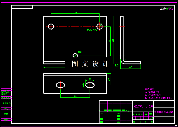 本次设计零件为紧固车厢用上角铁,该零件为L形弯曲件,形状比较简单,无其他形状突变,产品上两个直边上都有孔,而且是圆孔,在冲压过程中,此孔位置精度要求不高,完全可以弯曲之前冲出来,且孔边到外形的最小距离大于材料厚度两倍,所以利用落料冲孔模冲裁是可以实现的,由于年产量比较大,建议采用复合模冲裁,然后单独弯曲,可以实现。