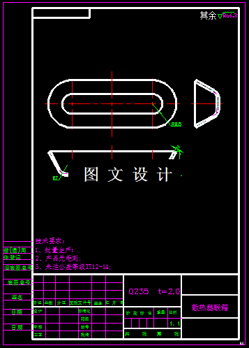 本次课题如图,拉深高度尺寸小,且四周有R角过渡,形状较简单,且对称,便于模具的加工,本次课题拉伸高度达到21mm即可,且四周有锥度,所选材料为Q235钢,属于普通碳素钢,其抗拉强度为380-470MPa,抗剪强度为310-380MPa,屈服极限240MPa,延伸率21%,从材料性能分析,该材料适合做冲压件。