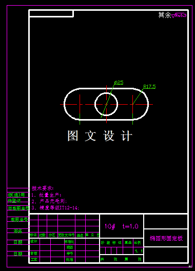 本次课题名称为椭圆形固定板,外形为腰圆形,中间有个圆孔,孔边到边的距离为5mm,超过两倍材料厚度,所以适合采用复合模具,工件材料牌号为10#钢,查文献,是一类优质碳素钢,塑性好,焊接性好,很适合冲压,本次设计内容包括模具平面图,立体图,设计说明书。