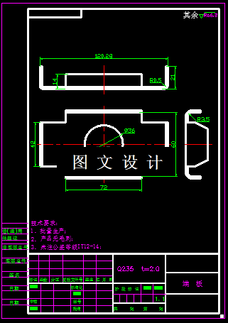 本次课题设计的工件名称是端板,该零件基本工序有落料,冲孔,弯曲,结合零件形状及工艺情况,本次设计弯曲冲孔复合模,弯曲四周的同时,冲中间孔,该模具采用后侧导柱模架,左右两边的导柱和导套采用相同的型号。本模具性能可靠,运行平稳。