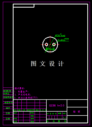 此制件的形状较简单,外面是一个圆形,中间有两个孔,位置对称分布,方便设计模具和加工。产品材料为Q235钢,厚度为t=2.0mm,此材料属于优质碳素结构钢,其抗剪强度310-380MPa,抗拉强度380-470MPa,具有良好的冲裁性,设计内容包括平面图,零件图,装配图,设计说明书。
