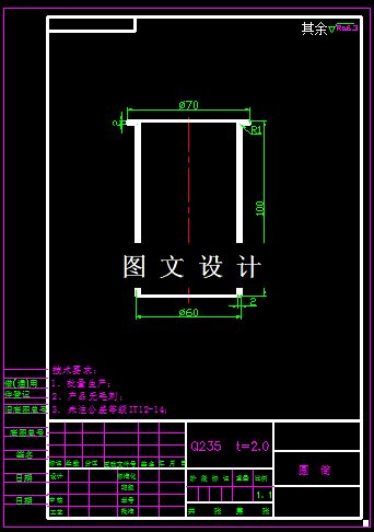 此零件一眼看上去,为筒形件,中间空的,所以可以用板材设计冲压,经过多次拉深,最后冲完再冲出底面的孔,实现最后的成品,也可以选择管材,只需要将口部翻边就能实现,这方法比用板材简单多了,工件材料牌号为Q235钢,查文献[1],是普通碳素钢的一种,设计内容包括模具装配图,零件图,3D立体图,设计说明
