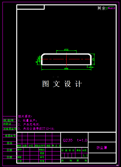 由图而知该图的零件外形尺寸不大且外形简单,要求的精度也不高。该零件中间有1个φ36mm的圆孔,由于圆孔尺寸大于2倍料厚,所以不属于深孔冲裁,故没有必要对孔冲头采取保护措施,工件基本工序有落料,拉深,冲孔等,本次设计只需要设计其中的落料拉深冲孔复合模,设计内容包括平面图,装配图,设计说明书。