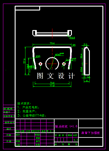 本次设计内容包括平面图,设计说明书,此工件为靠背下加强板,其形状较简单,为三边弯曲的零件,且对称,三个角圆角过渡,且一侧为斜边,为方便模具的加工,减少冲压时在尖角处开裂的现象,所以展开后尖角处需要增加过渡R角,根据产品材料厚度1.6mm,选择过渡R角为R5,所选材料为酸洗钢板,此材料为普通质结构钢。