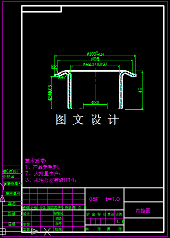 此零件名称为轴承座,是皮带输送机中的一个重要零件,精度要求较高。用料厚3.0毫米的08F钢板冲压成型,从图中可以看出,它是一个具有曲边法兰的筒形件,曲边的目的是为了增强法兰的刚度,从图中尺寸可以看出,轴承座内孔精度较高,为φ620-0.03mm,此处是装轴承的地方。法兰外径为φ1030-0.14mm,要求也较高,是为了同皮带运输机上锥形滚筒内孔相配合。此外,曲边法兰下平面同圆筒内底面的距离为42±0.08mm处等,要求都很高,由此可见,该零件的冲压难点如何保证产品内孔精度要求。