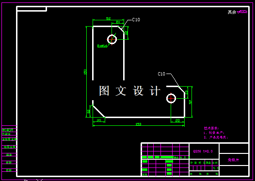 本次设计的课题形状为角垫片,产品形状为直角形,工件内部有两个圆孔,所以基本工序有落料和冲孔,