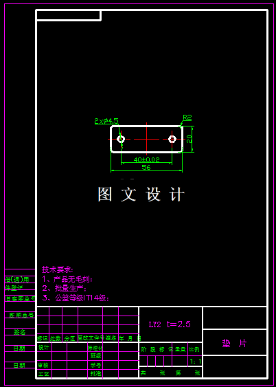 该工件形状为平板,只需要设计其冲裁模即可,从形状分析,该零件形状简单,且对称,避免复杂形状的曲线,把冲裁件设计成少、无废料排样的形状,以减少废料,工件形状为矩形,直角处用圆弧连接,以利于模具加工。