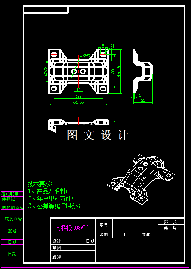 本次设计的工件名称为内挡板,工序模具设计的是冲孔模,是在成型的基础上冲孔,工件形状相对复杂,但是是对称的,所冲的孔为圆形,更为合理,便于模具的加工。