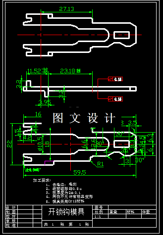本零件采用的是2mm的镀锌钢板料带冲压而成,由图而知该图的零件外形尺寸不大且外形简单,要求的精度也不高。但有两个地方,是上下弯曲的,弯曲方向不一样,而且带有撕边,所以一次冲裁很难完成。该零件有一个3.3x8长方形孔。还有一个槽。由于方形孔的尺寸大于料厚所以不属于深孔冲裁,故没有必要对小孔模采取保护措施,所以对凸模不需要进行强度校核。从材料来说,该零件比较薄,便于成型,故该零件有利于冲压成型。