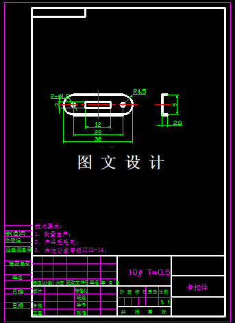 本设计是针对卡扣零件进行工艺分析及模具设计,具体根据工件形状及尺寸,详细分析其基本工序,有落料,冲孔,弯曲,工件外形比较小,采用复合模或者单工序模具,不但模具成本高,工件周转困难,而且工件小,工人操作不方便,因此,本次设计采用级进模最合理,具体设计方案见CAD图纸。